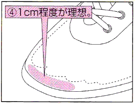 ④爪先のゆとりは、ウォーキングシューズなら7~10mm程度、スポーツシューズなら10~15mm程度が理想です。指で押してゆとりを確認します。
