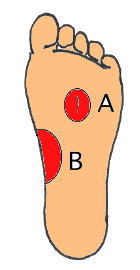 さらに指先を広げる方法として、足裏のAの部分にパッド(ペロッティパッド)を入れることで横アーチの保持とともに、指先が広がりやすくなります。又ここは湧泉というツボに当り、血行促進に作用します。ここにパッドがあることで足が前にのめりにくくなるなどいくつにもメリットがあります。足裏のBの部分にパッド(アーチサポートパッド)縦アーチの低下をサポートします。