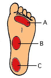 靴底が薄く・硬い衝撃吸収力のない靴を履くことで足の裏(足底)の筋肉を覆っている膜が炎症を起こしたり、扁平足などで足のアーチが崩れ、この膜が引き伸ばされて炎症を起こします。この痛みは主に足底前部A 足底中内側B足底後内側Cに多くみられ、足のアーチを補助することで和らげることが出来ます。※ 踵 痛 ※ - 踵骨と指の付け根は厚い筋肉で結ばれ着地する時の衝撃を吸収しています。踵の痛みは、長時間の立仕事や衝撃吸収力のない靴を履くなど足を酷使することによりこの筋肉と踵骨を継ぐ靭帯が強く引っ張られ靭帯が骨に付く部分に炎症を起こし痛みとなります